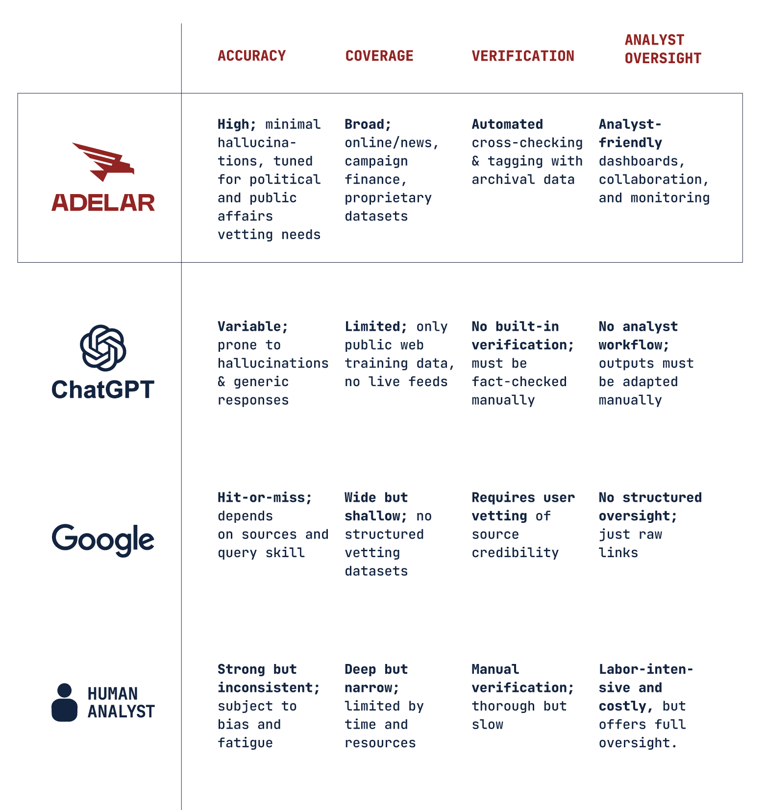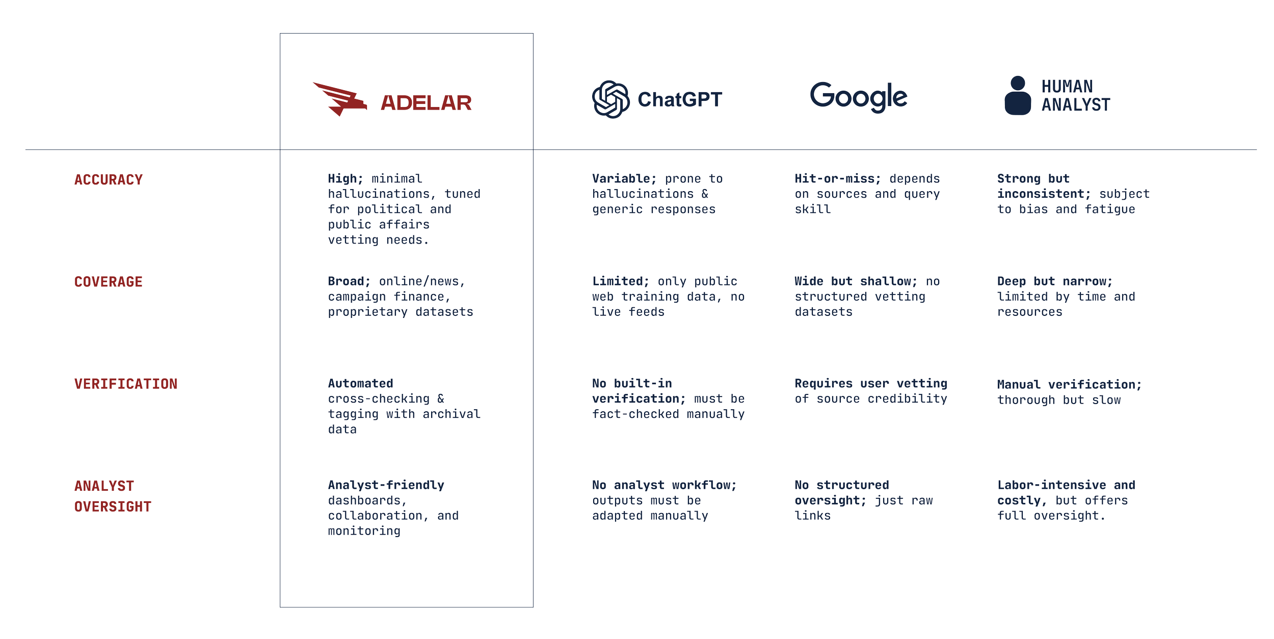 Adelar delivers enterprise-grade vetting, due diligence, and reputational insights with analyst-level accuracy, powered by AI and enhanced by experts.