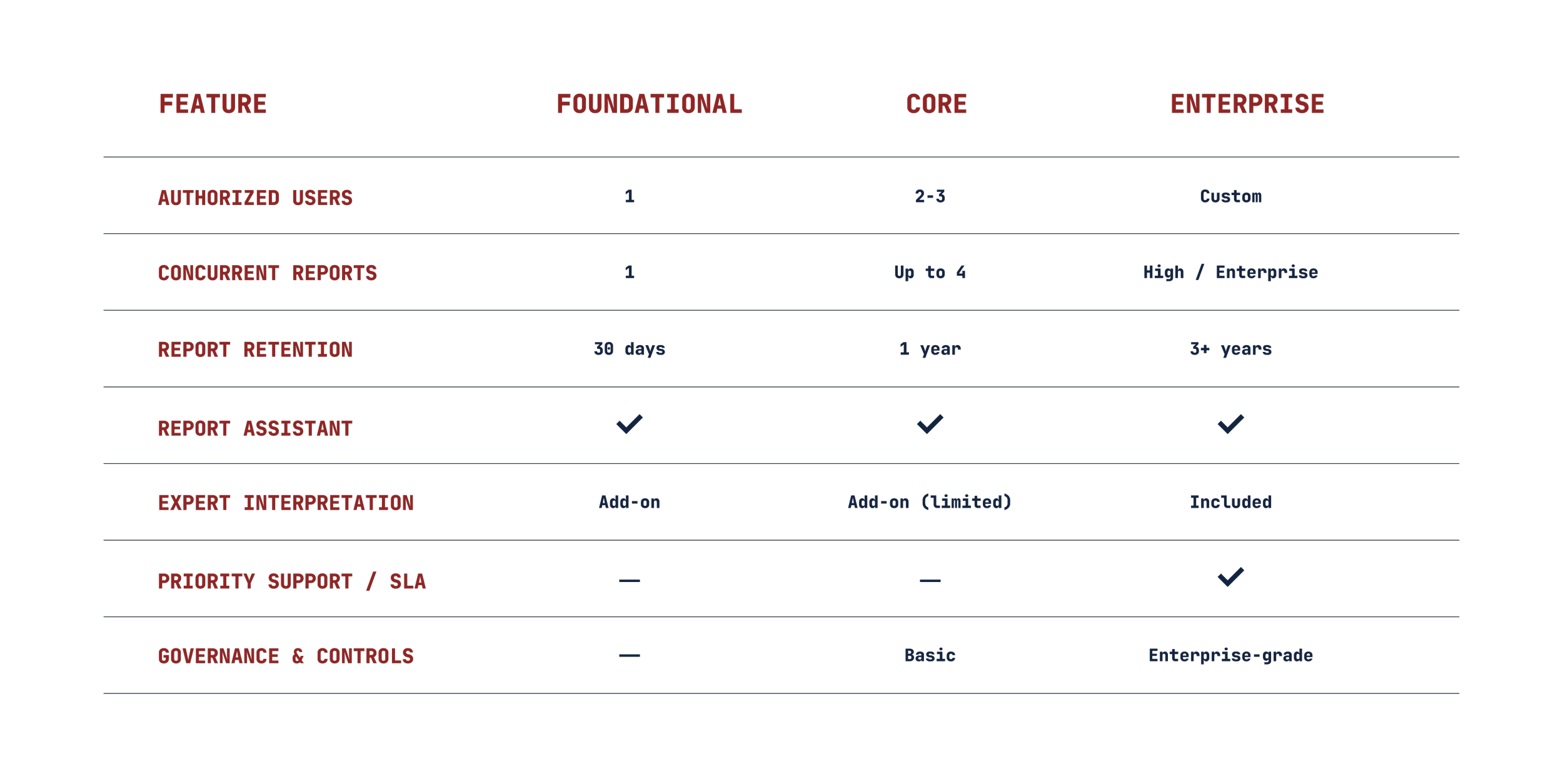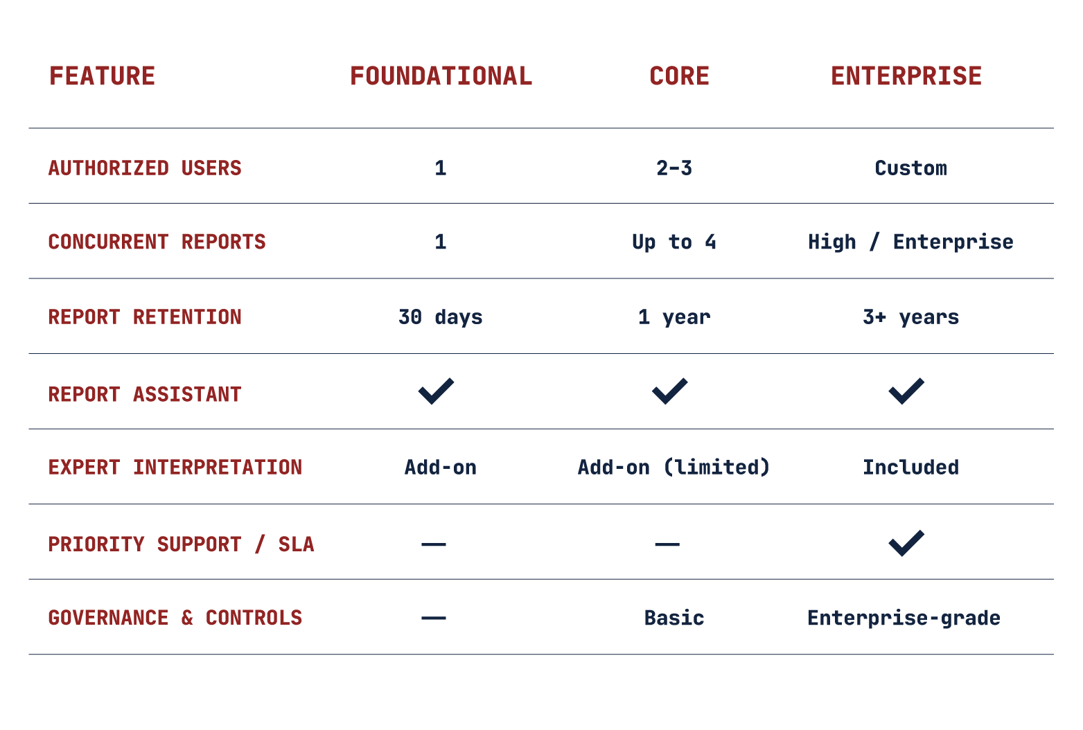 Expert interpretation — Deep contextual help with understanding platform results (included at Enterprise; available as add-on for Core/Foundational